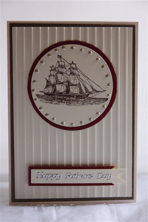 I saw a card simialr to this while I was blog hopping, and thought I could repeat it with the supplies i had on hand, and this is what i came up with. I used Stampin Up cardstock – crumbcake,Very vanilla,early espresso and Cherry cobbler and the boat stamp is from Stampin Up the Open Sea stamp set.I used an embossing folder which i can’t recall the brand name of and my circle nestabilities. For around the port hole I dotted platinum liquid pearls, and my stamp pad of choice was stampin up choc chip. Another day spent planning lessons, nearly done now! Til tomorrow…
