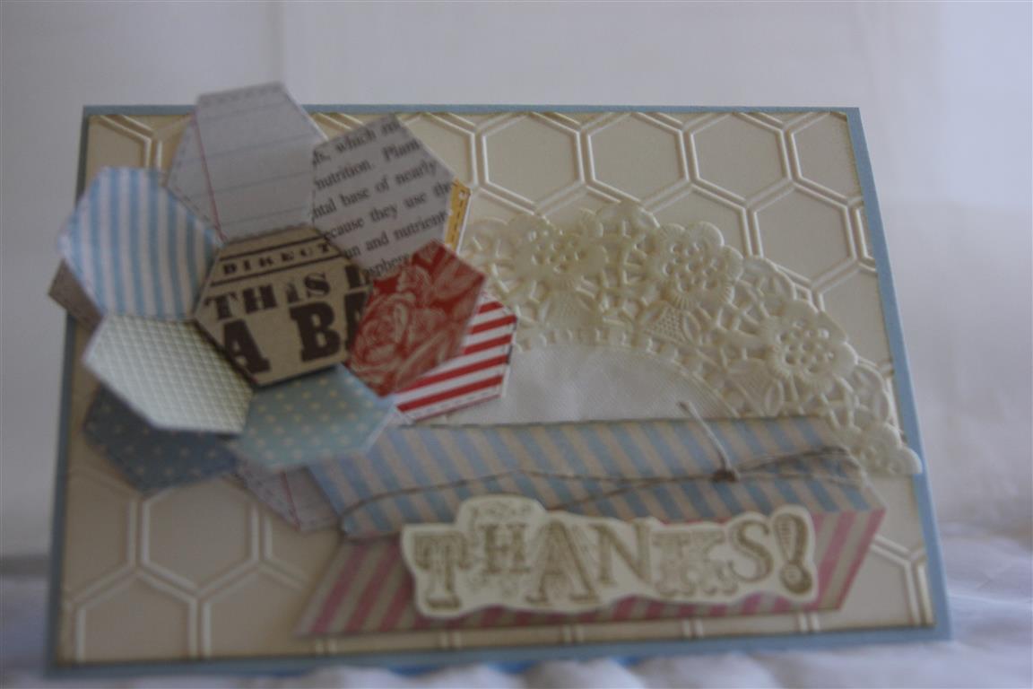 A bit more paper from the Tea for two designer paper range from Stampin Up. This time I cut out some of the hexagonal paper, and layered it onto each other to make this hexagonal flower, and added an inked doily, a bit more paper wrapped in twine, and stamped a sentiment from the Vintage verses stamp set with soft suede ink. The embossed background was achieved with my stampin up honeycomb embossing folder onto very vanilla cardstock, and the card base is stampin Up Bashful Blue.I have finished making the sewing box I was doing, and am eager to get back to my cardmaking, but once again it is incredibly hot here, so it may be a cool night under the air conditioner watching t.v! Til tomorrow…..