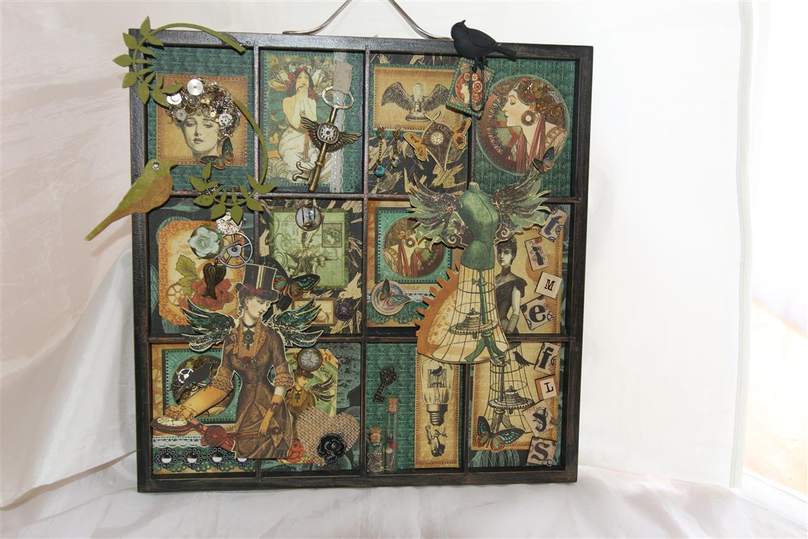 Not a card today! Instead I thought I would show you what I made over the Easter break. I have had the printers tray for about a year now, and always knew what I wanted to do with it, and finally sat down and just did it! So co-incidental that Marcelle commented on my last post about time flying because that is the theme for this one!I used Graphic 45 Steampunk Debutante paper collection, and added lots of recycled bits and pieces such as buttons, hessian, watch parts, beaded jewellery, and Prima letter tiles and canvas bird, twiddleybitz leaf flourishes,tim holtz glass bottles and lots of other bits as well.I aged the tray a bit by lightly brushing with gold viva paint.Today is an exciting day in my blog history as well, as sometime in the next few hours someone is going to be my 200,000th visitor.Amazing! Thank you all for sticking with me – I know a lot of you have been with me from the beginning( way back in 2010)and we’ve come a long way since then! Til tomorrow…..
