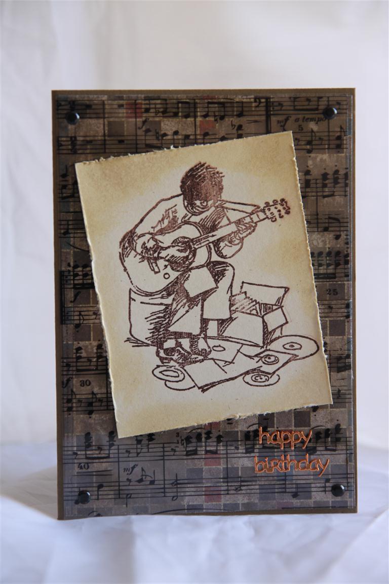 I picked up a great stamp set the other day – Nostalgia Pastimes by docrafts papermania. It has lots of great images for mens cards and this is one of them. I used Stampin up cardstock for the base ( Early Espresso) and some Coredinations put through the cuttlebug with Marg’s melodies ( cuttlebug brand) embossing folder.I sanded that back a bit, and added a couple of brads, and done!Sorted out my Market boxes today, not much left in them, so I won’t go to the market next month, and concentrate on building up my stock. Til tomorrow….