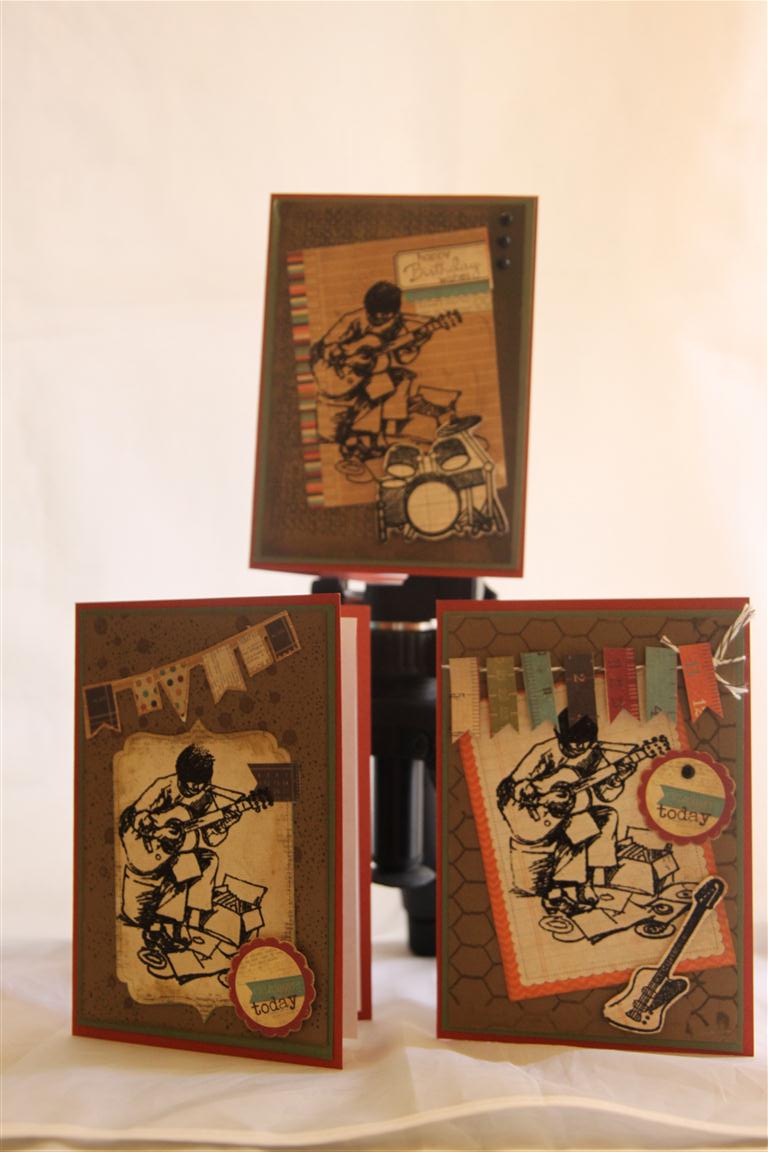 I think out of all the cards I am asked to make teen boy cards are the hardest, so over the next few days I will show some deigns I have been working on which should covers all the bases! Of course if they are into sport it’s not so hard, but nowadays there doesn’t seem so much sports played, sad really…. anyway … I am sure you have seen me use this stamp before – it’s from a great papermania (Nostalgia) set which also has a lot of sports images on it, and I have teamed it with a guitar stamp and drum set stamp that I have had for so long I can’t remember the brand name but Snag em rings a bell.The paper I have used is from a great 6″ pad called Year – o- graphy by Simple Stories, the patterns are great for these designs. I have cut assorted banners, and used bakers twine and brads for texture.The cardstock is Stampin Up Soft Suede and cajun craze – a colour I don’t use nearly enough. One last push tonight on the orders that keep coming through, and then back to lesson planning…. Til tomorrow….