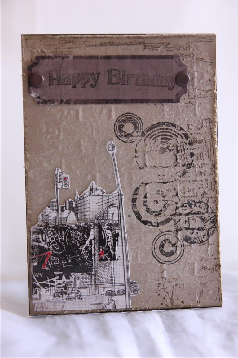 Here is a teen boys card I made using a scrap of paper from Kaisercraft Attitude 6″ paper pad, a tim holtz sizzix embossing folder – Bricked, and a mix of stamps from Bitty grunge set by stampers anonymous.I distressed and inked all the edges and added a sentiment to the top with brads.It tickled my fancy that the shape of the paper piece I used for the greeting looks a little like those old fashioned street signs! I’m off into the craft room and looking forward to unwinding in there! Til tomorrow…..