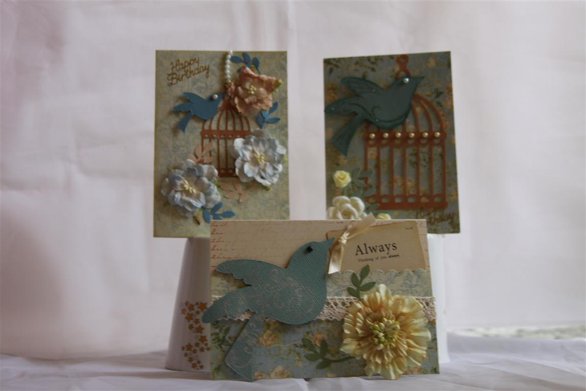 These are my kind of cards! The paper is gorgeous to work with – Prima Botanical collection, and perfect for backgrounds on cards like these. I used my cricut and the Serenade cartridge to cut the birds and cages in a couple of different sizes, then sponged the cages with Tim Holtz tea dye ink, and stamped the birds with a swirly stamp in versamark ink and brushed on some perfect pearls powder which brought up the swirls a treat! Also used were asorted flowers,leaf punches,lace and ribbon. Great fun! Til tomorrow…..