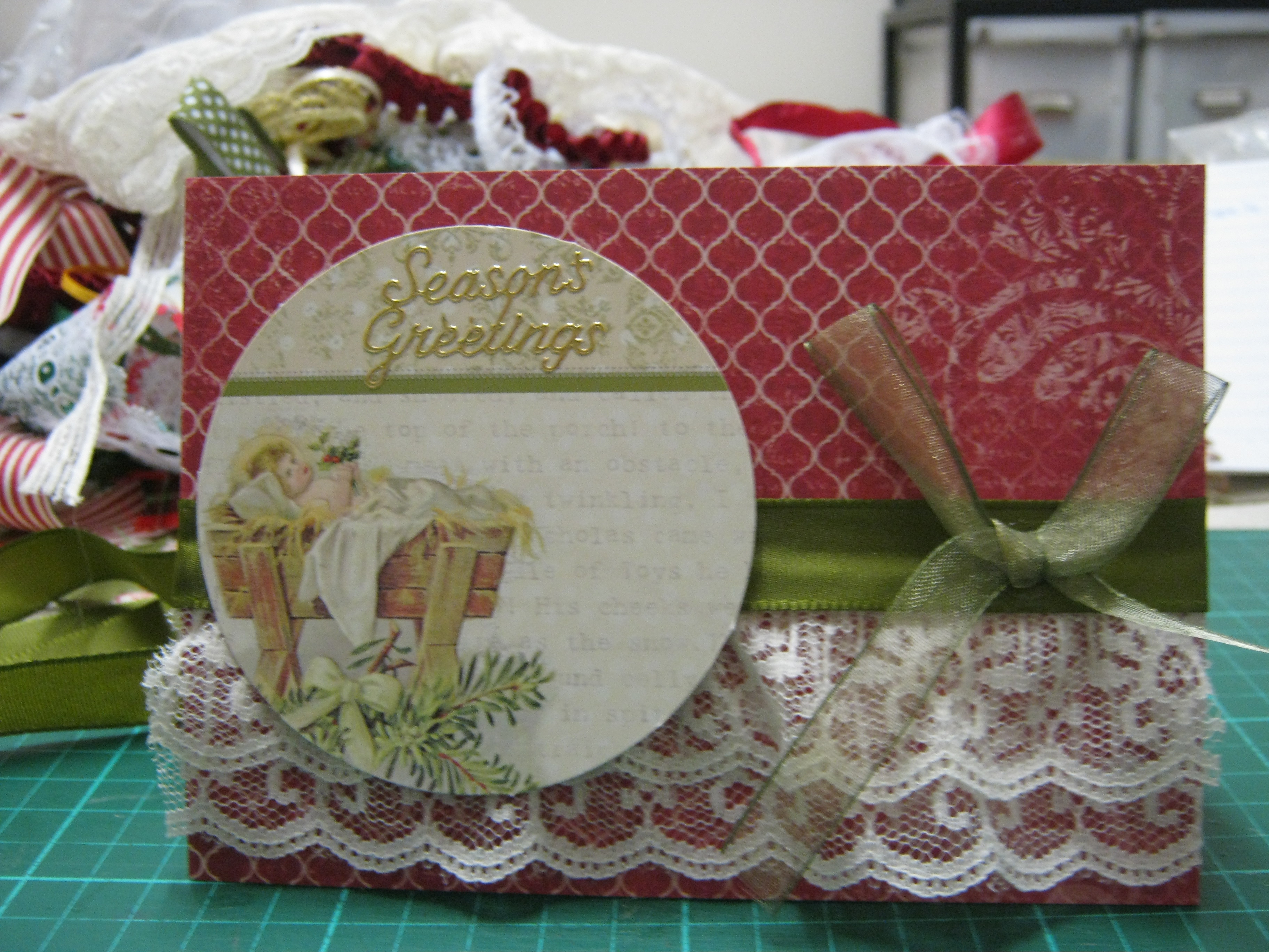 Today I have used the 6″ pad on both cards, even the fussy cutting elements, with the exception of the santa image which comes from the pull apart 12 x 12 sheet. I have used the Nuvo drops on all my red berries, and added some gorgeous ribbon and lace on the second card ( which is a little blurry…Nathan must have sneezed!). As usual every thing is inked around the edges with my go-to distress ink which sits on my desk..Tea Dye. All packed and ready to head out to my monthly craft and chat gathering, gee time flies, it just seemed like last week we were all together! til tomorrow….