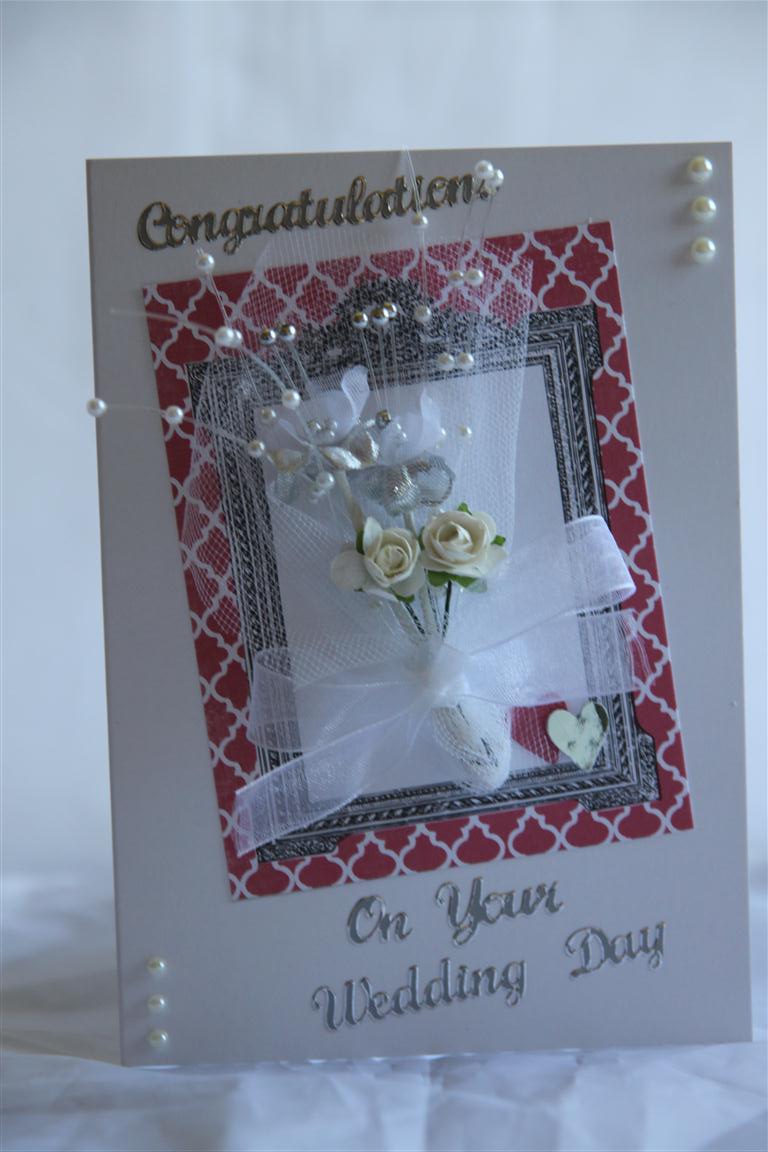 This is a wedding card I made for an order,I usually take inspiration for the colours for wedding cards from the colours of the invitation, in this case it was white,black and silver. The small amount of patterned paper is from kaisercraft After 5 collection, as is the label with the sentiment ( stampin Up mr. and mrs stamp)and the die cuts which are from the collectable pack The two hearts are die cut with Do Crafts x-cut hearts and I ran them through a couple of different embossing folders to add a little texture.All that was left to do was add bling,lace and a flower! I have had a hugely enjoyable day in the craft room today, it’s been a shabby chic day in there today, and a little tidying up and using some old stash happened as well. All in all very productive! Til tomorrow….